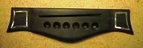 Above are photos of the ebony bridge I fashioned for the dreadnought. The customer had wanted the shape of the peghead mirrored in the shape of the bridge, so I took a standard Martin bridge and sanded it to its new contours. Then, to "fancy" it up a bit, I inlaid some abalone strips into the ends of the bridge (the customer seemed to like "fancy"). To the right, is the finished guitar, after I have applied the finish, bolted on the neck (gluing only the underside of the fingerboard extension), cut the nut, and glued on the bridge. All that is left to do now is to string it up and adjust the action!!!!