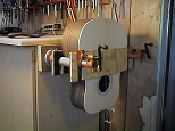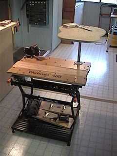 This is a guitar vise I made out of some old pipe clamps. Here's what my workboard looks like now. The other "guitar stand" workboard set-up was kind of wobbly. I had an extra flange and shorter pipe section lying around, so I thought, why not attach it to my Workmate instead? The Workmate's weight keeps it very steady. I still have access all around the board for clamping. And I have a handy table underneath it, too! The flange is easily removed, as it's just bolted on. |