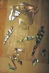 To the left are all the pieces of abalone (Paua and green) it took to create the "horse" and pine tree inlay I did on the last Size 5 that I made this past summer. It took 10 pieces for the horse, 3 for the trees, and 5 for the three letters of the customer's name (the "M" was so thin, it broke in two places). | |