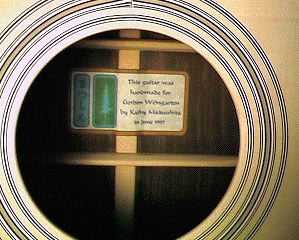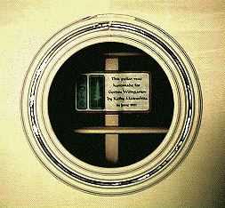 | Above is the top, after I have routed out the soundhole purfling channels and cut the soundhole with my Dremel circle cutting attachment. | Above is the top, after I have glued in the soundhole purfling. Glued into the middle of the center ring is a teflon strip, which will later be removed to insert the curved abalone strips. |