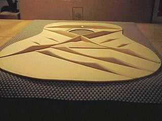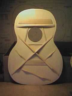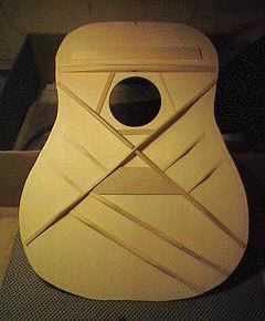 Above is a view of the top from another angle, more clearly revealing the scalloped braces. To the right, is the finished top of the smaller-scale Size 5 guitar. Notice the slightly different bracing pattern. |