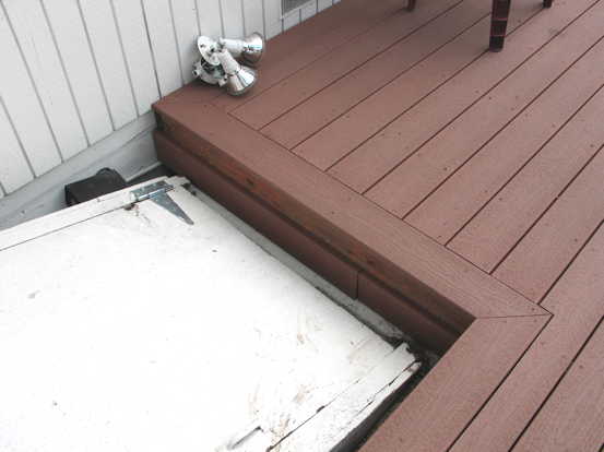 Saturday, June 11th, 2011: I thought I had pretty much puppy-proofed my house and yard . . . but, no, I guess I was wrong! Yesterday, I heard a little bit of barking from the back yard, so I went out there to investigate. (It's not a common thing to hear Hannah barking.) I couldn't find Hannah out there, but I did still hear her barking — underneath my feet. Turns out she had somehow managed to get herself under the deck, and she couldn't get herself out! There were two places where there was no deck skirting, and there was space enough for a little puppy to crawl into. On one long edge of the deck, there was a space that ranged from around 11" high all the way down to 6" high, with a water pipe running the entire length along the edge. And, at the front edge of the basement bulkhead door, there was a 5" high space running about 3 feet. I'm not sure which space she had used to get under the deck . . . I went to the long open side, where it sounded like she was, and kept calling her to come. She crawled and just managed to squeeze herself through the opening, over the water pipe. I was relieved that she was able to manage it — if worse came to worse, I figured I might have to remove one or more of the decking boards to enable her to get out. SO . . . Guess what my next home remodeling project was to be???? Yes, you got it right — figuring out a way to close up those open spaces! I didn't want something too complicated or too expensive. I just wanted something cheap and easy. So, off to Home Depot I went. What I finally ended up doing was just getting a bunch of 5" mending plates and 4 six-feet redwood fencing boards. I just screwed the mending plates to the boards , and then screwed the mending plates to the deck edges. Not pretty, but it does the job. For the open space at the basement door, I just screwed a couple of leftover decking boards to close up the space. Look below for the results. |