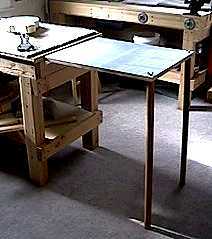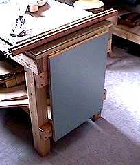 To the left are all the separate parts that make up the guitar body vise. I have attached two pipe flanges (16" apart) to the bench. When I need to use the vise, all I have to do is pull out the parts and attach them to the flanges. When I don't need the vise, everything is stored away! |