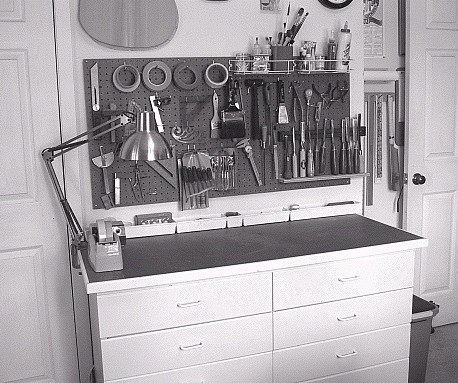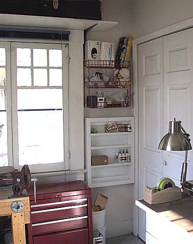 Here is my most exciting recent "find" --- my new workbench!!! For years, I had been on the lookout for a bureau that would just fit this space, one which had plenty of large drawers and was sturdily-built. I hadn't had much luck. But, finally, this summer, I spotted one in a local Goodwill store. Its tag said $100, which I was perfectly willing to spend. So up I went to the register to pay for it, and what do you know....it was on sale for $69!!! My lucky day!!!! I took it home, stripped it of its ugly red-brown paint, repainted it, replaced the drawer pulls, and attached a 1" thick masonite and tempered hardboard top. It's perfect --- it has four large drawers on top and two double-deep drawers on the bottom.