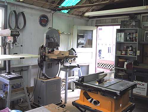 Here are a couple of shots of my workshed, with my Delta 14" bandsaw and 12" drill press. I bought the drill press table and built the bandsaw table from some plans in a woodworking magazine. |