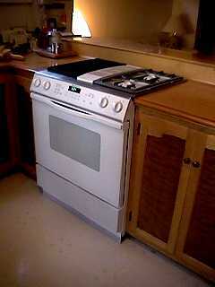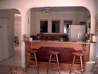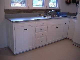 Here's one half of my new Formica countertops and newly-repainted cabinets (I did that part myself!). It just got installed this week (4/6), after almost two months of my waiting. What a difference the new colors make! Up above the backsplash, I've filled in and leveled the wall surface under the windows, in preparation for some 4" tiles I plan to install (I've never done that, either!). I can't wait till the other side gets done (they measured wrong and have to remake that counter). |