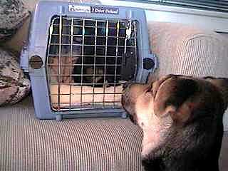 Well, I've had Emily now for about five weeks. She's now able to "hold it" and stay in her crate from about 6:30 a.m., when I leave for work, until about 11:30, when either my mom or my aunt come over to feed her and let her out. They play with her for a while and then put her back in her crate until I get home from work. When I get home, she's pretty much free to cause whatever trouble she can inside the house (with occasional "breaks" back in the crate for my sanity). But she's pretty good . . . not too many "accidents." And whenever she does have an accident, it's always on the newspaper I have set right next to the back door, so I know she knows that she's supposed to do her duty outside.