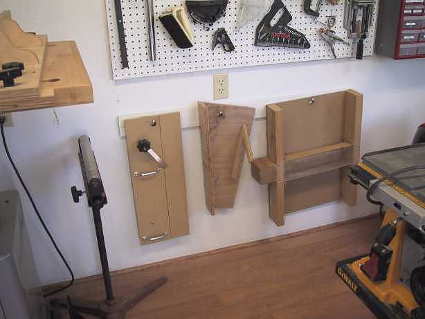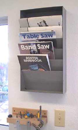Below left are my tablesaw jigs --- the taper jig, scarf joint jig, and crosscut sled. Below right are my tools' manuals and some other helpful books, so I don't have to go running back into the house every time I need to look something up. |