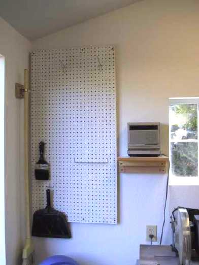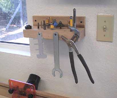 Here are some photos of some special shelves I made, for particular purposes. Below is a little shelf I made for all my router bits, the router wrenches, depth gauge, and a Channel-Lock pliers I use to turn the router adjustment knob. To the right is a clock-radio/TV I've had for years but wasn't using. It's just right for this space!