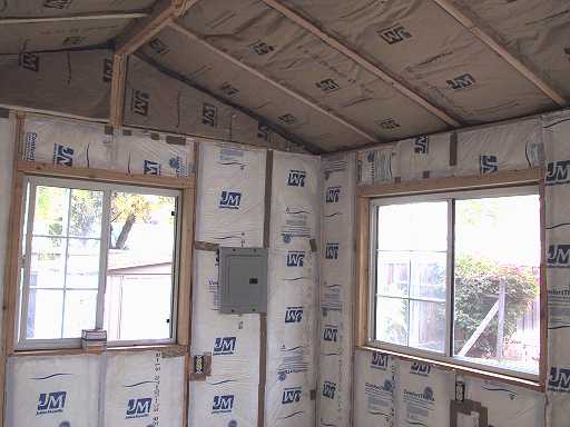 Well, I haven't posted anything new here for about a week because I've been kind of busy doing, as you can see to the left, the insulation on my shed. This is the first time I've done any insulating. Doing the walls wasn't that hard, just a bit tedious and time-consuming.