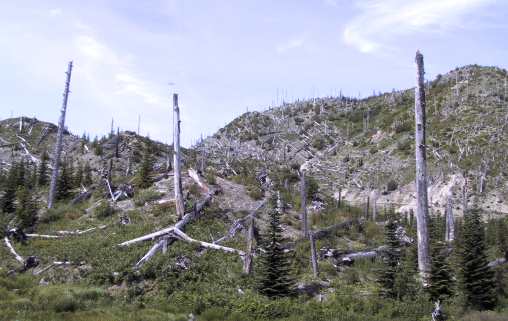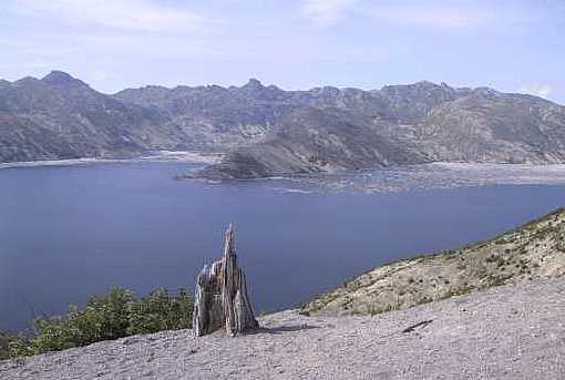 BELOW: All that white stuff you see piled up against the edges of Spirit Lake are logs. When Mt. St. Helens erupted, rock, ice, and debris slammed into Spirit Lake, crossing a high ridge, and continued on, roaring 14 miles down the Toutle River. |