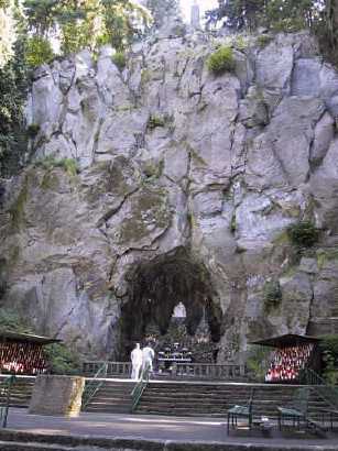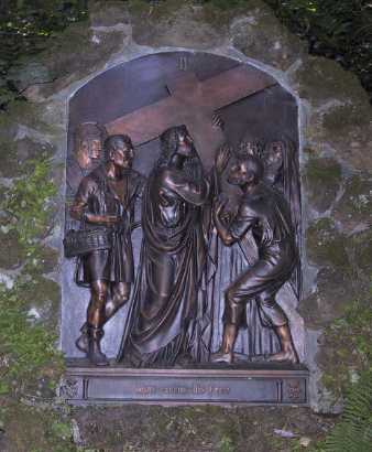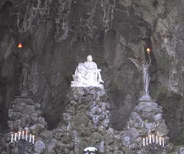 RIGHT: one of the 14 "stations of the cross" at The Grotto. At the entrance to The Grotto is this statue of Christ carrying His cross.