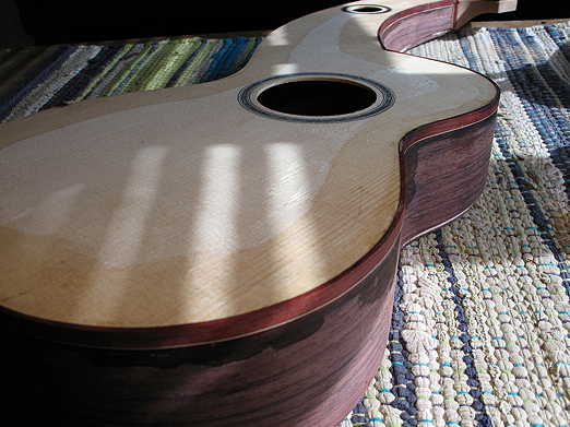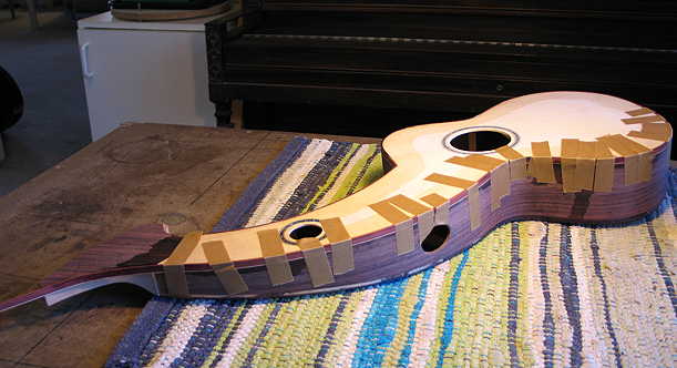 Two quick photos of where I'm at now --- I just bent the bass side binding for the top. Right now it's just taped --- I'm going to take a dinner break so that the bend will have some time to "set" a bit.