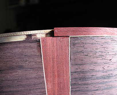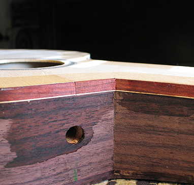 Here's the harpbox peghead end, where I also had to do some miter work. There will be a shallow-height binding strip running from the binding all the way around the peghead.
