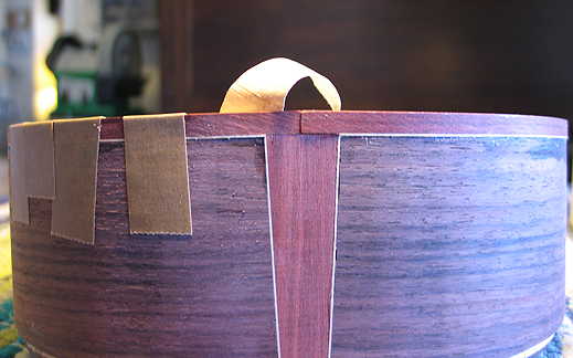 I tried something different this time, and it seems to have worked. As I began bending this piece of binding, there were some areas in the lower bout where there was a stubborn gap between the binding and the top; it seems the binding strip kind of twisted outward at the top edge, and I was having a hard time hand-bending the "twist" out of it. So what I did was to tape the binding tightly up to the area of the gap, and then, holding the entire soundbox, I pressed the binding into place against the bending iron, constantly sliding it back-and-forth to avoid scorching the binding. Occasionally, I would put a damp piece of towel between the iron and the binding, so the steam would help soften and mold the binding to the curve of the body. Well, it worked so well to get rid of the gaps, that I just continued to do the rest of the bending that way, all the way up to the end of the binding. After I eat dinner, I will remove the tape, check it all for fit again, make any necessary adjustments, and then trim the end for the miter in the corner.