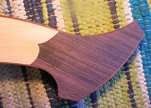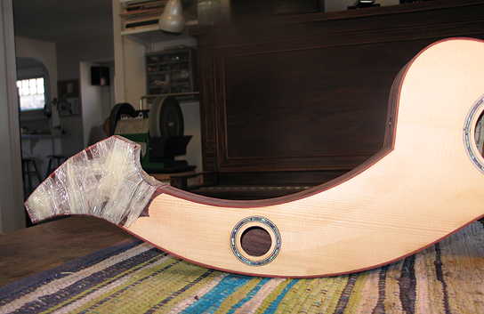 Finally, I bent and glued the shallow bindings on the harpbox peghead. This proved to be a little difficult, as the short curved section kept breaking on me! But finally I got it done, and it's all taped up now. We'll see how it looks tomorrow.