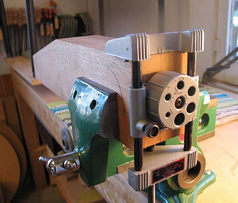 (2) Next, I traced the neck shape on the side of the neck blank, bandsawed (just outside the line) the peghead face (15° angle), and then trued up the peghead face on my jointer.