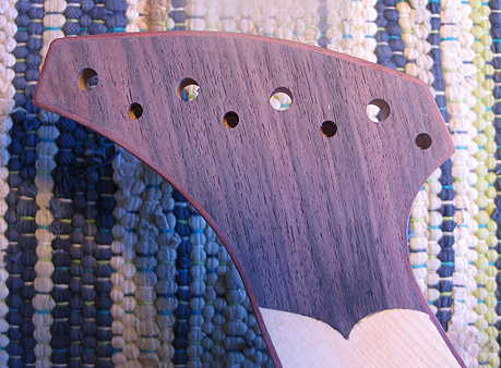 The first thing I did was to drill the harpbox peghead tuner holes and the holes for the string nuts. I used a 9/32" drill bit for the tuner holes and a 13/64" bit for the string nut holes (drilled only about 1/4" down into the peghead). I will use white bone bridge pins, with a slot sawn on the top, for the string nuts.