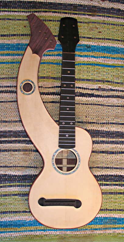 Here's what the bridge looks like, positioned on the harp uke. (Kind of looks like a quizzical or befuddled look on a face, doesn't it? I always seem to see faces on my instruments...)