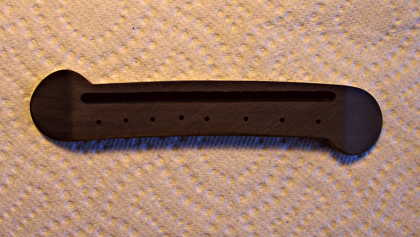 I then used the bandsaw to cut close to the template outline, following that with the disc sander and files to finish up the bridge. With the template still stuck to the bridge, I then used it to drill the eight 1/16" string holes.