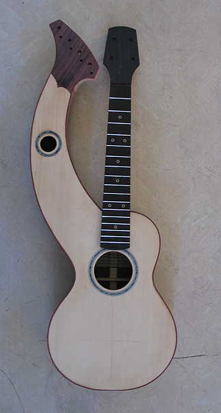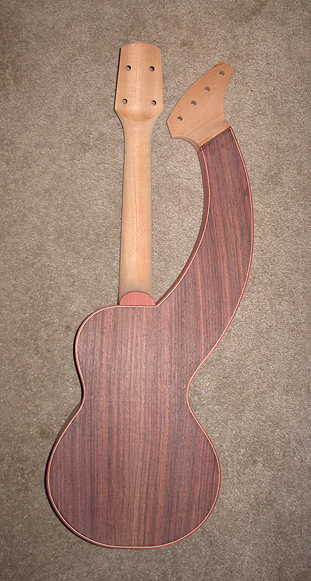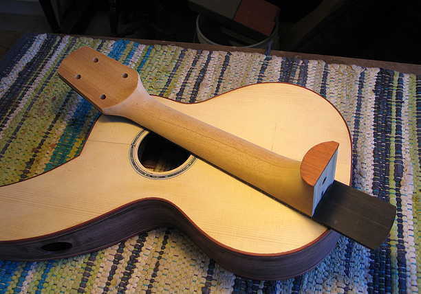 Here are some shots of the uke with the ncck bolted on. I re-checked the neck angle and centering with the soundbox, and ended up having to sand the bass side of the heel a little more.