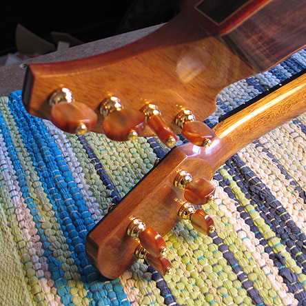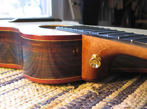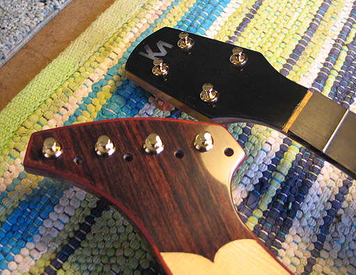 Only a few photos today --- Today I installed the tuners, strap buttons, and made the nut and saddle. As a starting point, I made the nut 1/16" higher than the height of the frets, and the saddle 4mm higher than the top of the bridge.