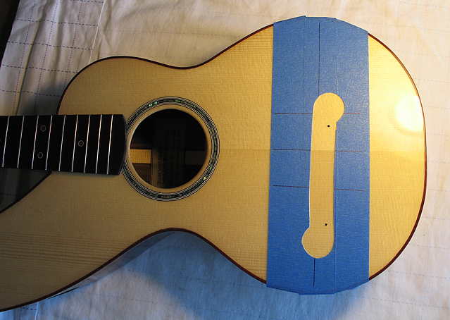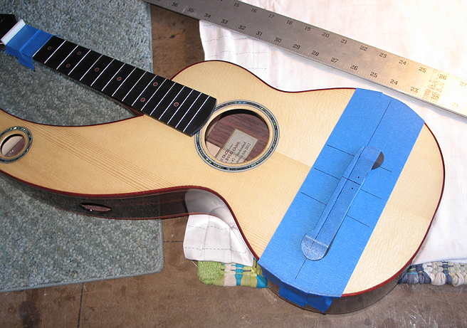 And here I am gluing on the bridge. I first applied glue to both the bridge and the top, placed the bridge on the top with the locating pins, and held it down a little while to let the glue set a bit and to wipe away as much of the glue squeeze-out as I could. Then I clamped it down lightly with this clamp I made a few ukuleles ago. (I drilled a couple of holes in the top strip of wood, so that I could keep the locating pins in the bridge as it set up.)
