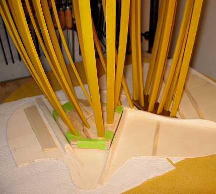 After I did that basic shaping of the braces, I went ahead and glued on the bridge plate, the cap for the x-brace intersection, and the soundhole braces. They're sitting in the go-bar deck right now: