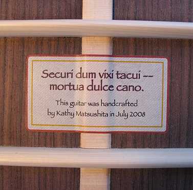 Next, I drilled through the two bolt holes in my neck block, through the rim. I signed my top and also made sure I had a bridge gluing caul that fit (I ended up adapting an old dreadnought caul I had lying around). I then made my label for this guitar. I printed it on some cotton linen paper I had, brushed a couple of layers of thin shellac on the label, and then glued it on: