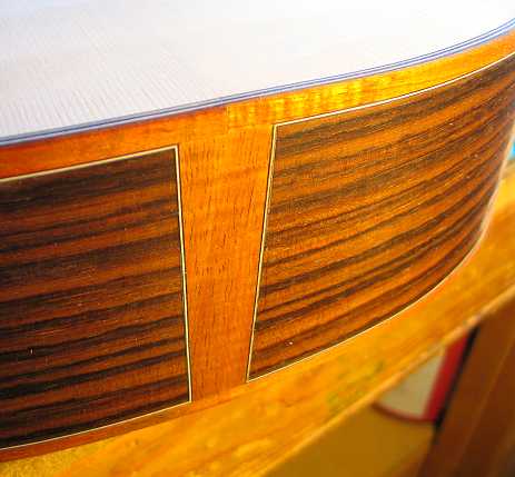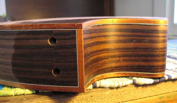 It's about 1:00 p.m. now. I just spent four hours scraping down all the bindings and purflings, sanding it all, filling any little gaps (by filling the gaps with Titebond and then sanding the area, so the sanding dust fills the gaps), and rounding the sharp edges of the bindings.