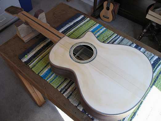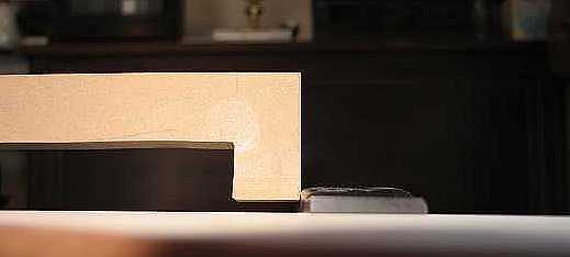 Now it was time to check the neck angle. I once again bolted the neck to the body, placed the unfretted fingerboard on top of the neck, and placed the bridge in its approximate position on the top. Placing a straightedge on the fingerboard, I could see that it was too low; the straightedge was quite a bit below the top of the bridge. What you want is for the straightedge to just "kiss" the top of the bridge.