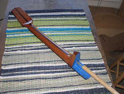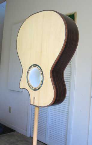 Sunday, August 10th, 2008: On Saturday I let the 3rd coat of Z-poxy on the back and sides sit for a while before I finally leveled it all down and put on a thinned coat. Today the first thing I did was to spray two coats of shellac (an hour apart) on the neck, which had been all leveled yesterday, as it had only needed two coats of the Z-poxy. Then I leveled the shellac seal coat on the top, and prepared everything for spraying the shellac seal coat. I attached a handle to the soundbox through one of the bolt holes. Then I found a margarine tub that was just the right size to fit snugly underneath the soundhole, to protect the insides from the spraying. Then I sprayed the soundbox with 2-lb. cut shellac (Zinsser Seal Coat), using a PreVal sprayer. (I did it this way because it's an easy way to do it and not have to pull out my compressor and spraygun until I was ready for the finish coats.) I sprayed outside, of course, but brought the guitar indoors afterwards (fewer bugs and all that way). When I spray, I hold the guitar by the handle and do what I can holding the soundbox horizontally. Then I place the handle in the bottom part of my roller stand, and I can spray it that way, as well.