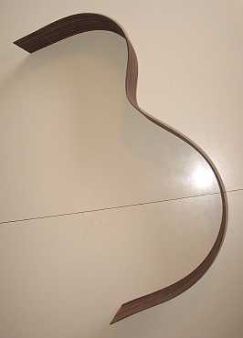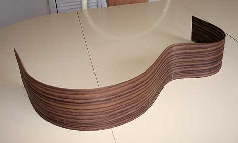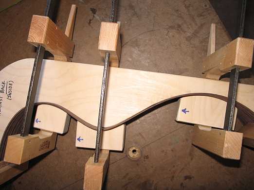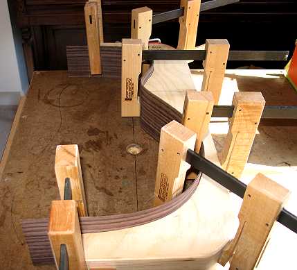 After that was done, I set about bending the cutaway side. The first step, as I mentioned earlier, was to use the regular bender to bend the lower bout, the waist, and the first half of the cutaway, up to the tip of the horn. I found I couldn't use the cutaway ram pictured here to do the entire cutaway, as this cutaway is much sharper than normal, and the side of the cutaway nearer the neck would not be held tightly to the form with the ram. I could make modifications to this bender, but it would be just as easy to use that other bending form I already had made for the cutaway.