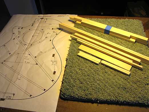 So, I'm going to let this sit overnight (just as I did yesterday's side), and tomorrow I will use the other bending form to finish up the bending of the cutaway portion. While I'm waiting on this, I think I'll start making my neck and tail blocks, and start cutting braces..... MANY, MANY HOURS LATER. . . . . . I can't believe how long it took me to produce what you see in the photo below!!! It was back-and-forth from my little power tool shed (way at the back of my lot) to my older shed, where my thickness sander is, over and over again! That's one of the disadvantages of having my guitarmaking areas in three different spots; it means a lot of traveling back-and-forth!!! Well, it's good exercise, anyway.... But I did it --- now I have all my top and back braces cut and ready to go! I only need to sand the radiuses (radii?) on those braces that need it. But that will come later....