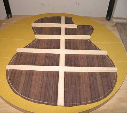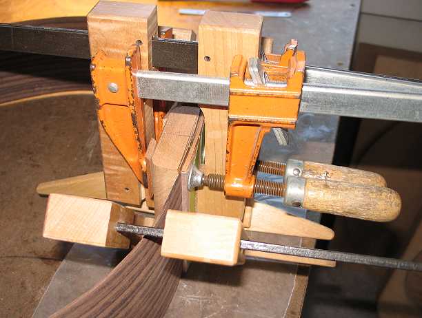 Here's another tip I got from Frank's videos. He uses a thin, flexible piece of mahogany as a clamping caul for gluing the slightly radiused neck and tail blocks. This I found easier than trying to make a caul with the corresponding radius sanded into it. Here I am gluing the tail block. TOMORROW: