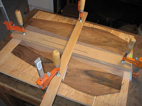 Saturday, July 3rd, 2010: Well, I've finally started this summer's project! (It's about time.) In the past few days, as I was looking up baritone uke plans, I saw Hanalima's plan for a Kasha-styled baritone. Now I know absolutely nothing about the Kasha technique of bracing, but, of course, the novelty of my trying such a different kind of instrument instantly appealed to me, and I decided to give it a go! I have no idea how it will turn out, or how (or if) it will sound different from a traditionally-braced uke, but I really felt like doing something different, just for the fun of it. I sent in an order to Hanalima for their baritone plan and am now waiting on that to arrive. Once the plan arrives, I can go about making a mold. But one thing I can do now is to begin to prepare my top and back. I am going to be using some Brazilian rosewood, which John Hall of Blues Creek Guitars sent me, for the back and sides, and some cedar (given to me by Kevin Pettit) for the top. Today I jointed and joined the top and back. The picture below shows how I begin to set up for joining the top/back halves. I lay the two halves on top of this yardstick (it makes the two halves "tent" up) and trace the outline of the outer edges of the wood pieces. I then pound nails along the traced outlines; these nails will support the wood when it's clamped. I place glue (Titebond) along the jointed edges of the top/back, center the jointed edges atop the yardstick, and then remove the yardstick. With the yardstick removed, the two halves will now clamp tightly together. I place waxed paper over the joint and clamp it down with a long wood strip. I also clamp another wood strip across the first strip, to make sure there is even pressure along the entire joint.
