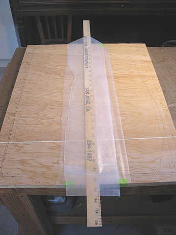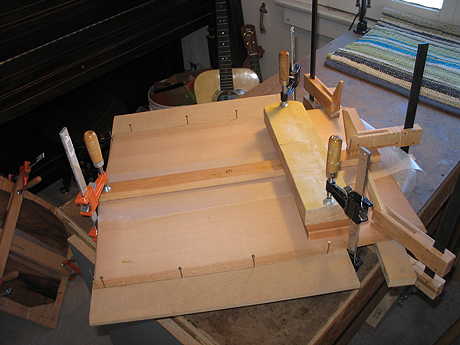 When I joined the top, I discovered I didn't have a second workboard wide enough to be able to support the top on all sides. So, I set it up the other way, as you see below, with a wood strip supporting the overhanging section underneath. It looks kind of weird, but it will work.
