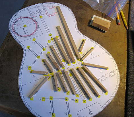Next, I spent about an hour or so, first bandsawing the braces to their proper heights (a couple are 1/4" tall, most are 3/16" tall), and then cutting out notches so that they fit over the bridge patch. Here I've laid them out on the bracing plan, so I wouldn't forget which one goes where.