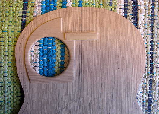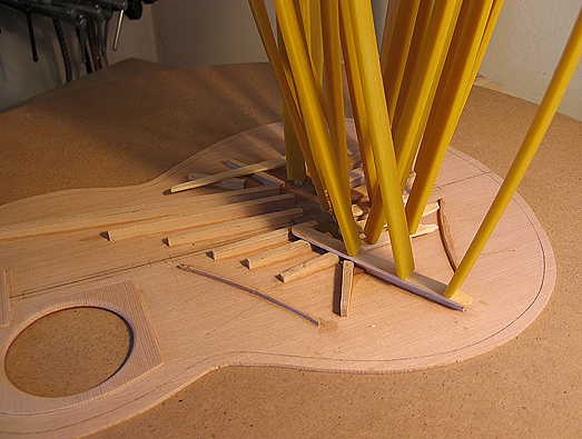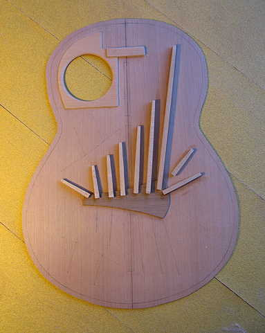 Monday, July 19th, 2010: Here are some quick photos of what I've worked on so far today, as I wait for the top braces I've glued so far to set. Oh, yeah, now would probably be a good time to eat some lunch, too. (I tend to forget when I'm really into the building.) The first thing I did this morning when I got up was to sand and smooth down the soundhole patch I had glued up yesterday. I also rounded over the soundhole rim.