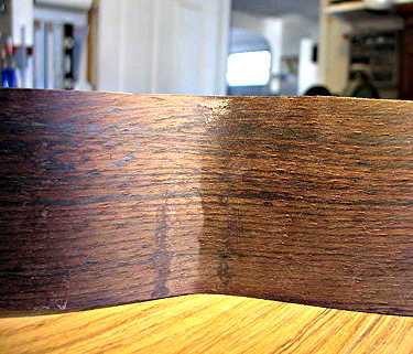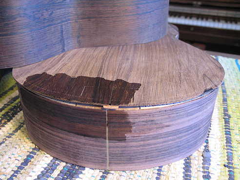 Tuesday, July 20, 2010: Lots and lots of photos today . . . . First off, I think I need to clarify something about the sides. When I was bending the Brazilian rosewood sides, one of them developed a crease at the waist when I was bending it. I'm not quite sure how it happened, but it may have been because I didn't crank down the waist all the way (as I normally do) before I started bending the bouts. (Some people say to only partly bend the waist first, and then finish it after you've bent the upper and lower bouts, so I had decided to try that this time.) At any rate, it creased, as you can see in the photo to the right. It didn't actually crack, but just kind of frayed a little on the inside. I tried straightening it out on the electric bender, and then rebending it, but I guess once there's a crease there, you can't bend it out. I just couldn't live with that crease there (even though the other side came out okay, probably because I bent it my normal way, cranking down the waist all the way before I bent the bouts), so I scrounged around in my modest wood stash and found some East Indian rosewood that was close in color (if not in grain pattern). To the far right I've slapped some shellac on both, to see if the colors would be close, and they are. So, I've decided to use the Indian rosewood. |