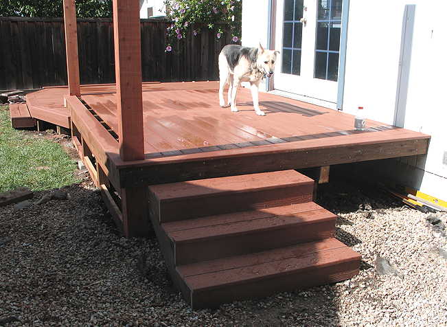 So, I asked the guys to also put a step going down to the lawn. Now Emily can handle it all just fine! I'm relieved. Tomorrow, I think they're probably going to do the skirting, the railings, and the lattice. Then, they'll do the arbor!