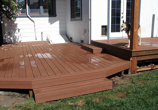 Now, for today's deck progress update: The decking done, today the workers built the steps. I originally had steps only going down from the upper deck to the ground, and from the upper deck to the lower deck. But Saturday I had Emily back home (my mom had been taking care of her while the bulk of the deck construction was going on), and I found that she couldn't handle the height from the lower deck to the lawn. (She has slight hip problems and was hesitant and a bit scared to try getting off and onto the deck.)