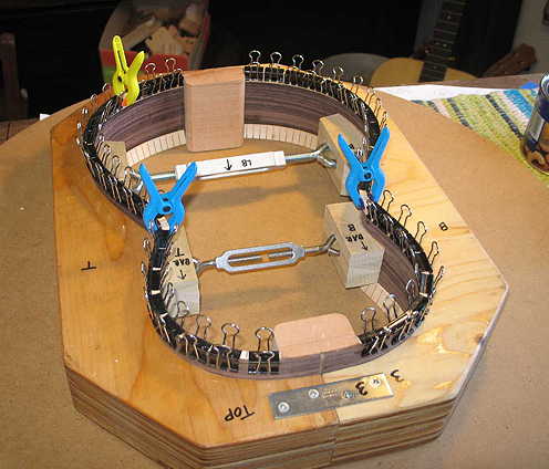Now, back to today's account: The first thing I did this morning was to glue on the top kerfing strips. To the right is the finished side set. |