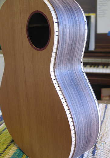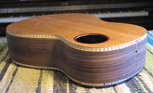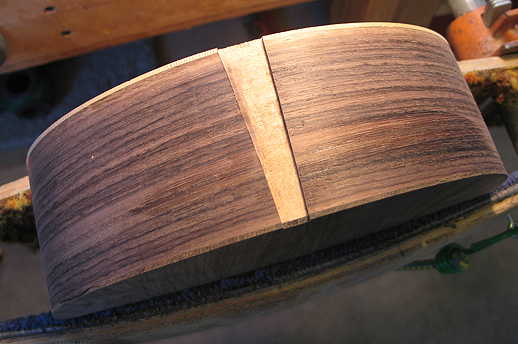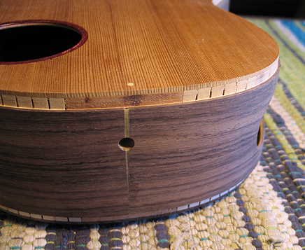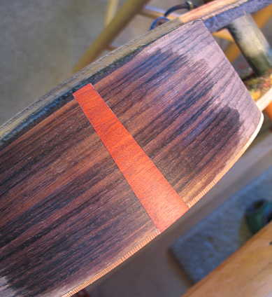 After the wedge was done, I took care of bending the bloodwood bindings. (Sorry, I don't have any photos of this.) I basically followed the same procedure as I did when bending the sides. I tape the bindings together, so the purfling strip attached to the binding doesn't delaminate, and I tape the bindings strip to a scrap piece of wood the same thickness as the bindings. (In the past, I'd crushed the bindings when I just put them by themselves in the bender, without anything to support the rest of the width of the spring steel slats.) They're still in the bender now. While the bindings were sitting in the bender, I could take care of routing the binding ledges. I used the Don Williams binding router jig once again, and it turned out really well. I first had brushed on a coat of shellac on the top, to minimize any tearout. The ledges came out really clean and consistent, so I'm happy! Here are some photos of the results: