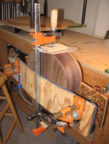 | Here I have clamped up the end wedge. | Here it is. I've dampened the side so you could see what the colors will look like under finish.