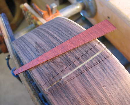 The first thing I did today (after making that little video you see to the left) was to use my bandsaw to trim the soundboard overhang. What I do is tilt the bandsaw table so that the blade won't cut into the side. After doing that, I used the belt sander (very carefully!) to make the top and back edges flush to the sides. That done, I could now move on to the job of the day: the end wedge and bindings. Making the end wedge was easy. First, I score the lines with an Exacto knife, cutting down as deeply as I can. (As you can see below, my first score line was wrong, so I had to make another one outside of that line.)