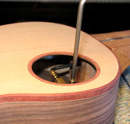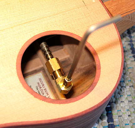 Here you can see the 2" long allen wrench arm goes into the bolt, and the short end of the wrench is epoxied into some sort of plumbing fitting that's just a tad larger than the 5/32" hex wrench. That fitting, screwed into some sort of plumbing L-thingie, extends about to the middle of the soundhole, and I have another allen wrench extending vertically, in the other end of the L-thingie. Since it's now in the middle of the soundhole, I have room to move it back and forth to tighten or loosen the bolt.