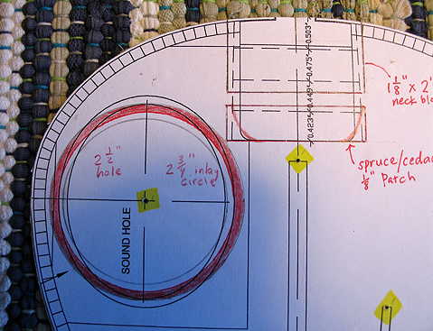 Here's the change I will make to the soundhole. I plan to move the soundhole a little bit more to the right (say, about 1/8"), so it will be a little bit further away from the outer edge of the top. |