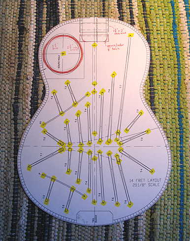 So, by then, I had pretty much decided I might abandon the oval soundhole idea. Next, I looked into just doing a round soundhole, with a bloodwood rim. Basically, I'd just cut out a bloodwood ring with my circle cutter, making the inner edge of the ring overhang the soundhole diameter by a bit, say, 1/8" or so. Then I'd inlay it into the top. Then I just cut out the soundhole. The edge of the soundhole would then be the bloodwood. Much simpler! I figured I'd want my soundhole to be about 2-1/2" in diameter. So, I went to my Stew-Mac circle cutter jig for the Dremel and discovered that the smallest diameter hole I could do with that was 3"! Rats! So, next I remembered that I had made a little plexiglass jig to cut a smaller diameter hole a long time ago when I first started making ukuleles, so I pulled that out. I would just need to make another pivot hole in it to be able to make the bloodwood ring. Then I remembered that, in a Dremel set that I had gotten when I got the Dremel 400, there was a circle cutter!!! (I was so used to using my Stew-Mac circle cutter, that I hadn't ever pulled out the Dremel one.) I took a look at it and, lo and behold, it is able to cut circles anywhere from 3/4" diameter up to 12"!!!! Perfect! It looks sturdily made (much better than the older Dremel attachments I had used long ago, like the Dremel router base). So.....I have finally come to my decision! I will stick with a round soundhole, with about an 1/8" bloodwood rim. I have drawn it up on the plan, to see how it will look, and it looks okay. I have drawn in red the proposed soundhole. I think I may move it over, though, a bit to the right, so it won't be so close to the binding edge of the top. I may curve the bottom corners of the fingerboard, also, to make it all fit better and look more balanced. What a day. But my mission was accomplished!!! |