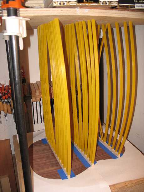 Next, I worked on the back braces. The first thing I did was to sand the 15' radius on the bottoms of the three back braces. Then, using the go-bar deck again, I have glued those braces on. The back is lying on top of my 15' radius dish.